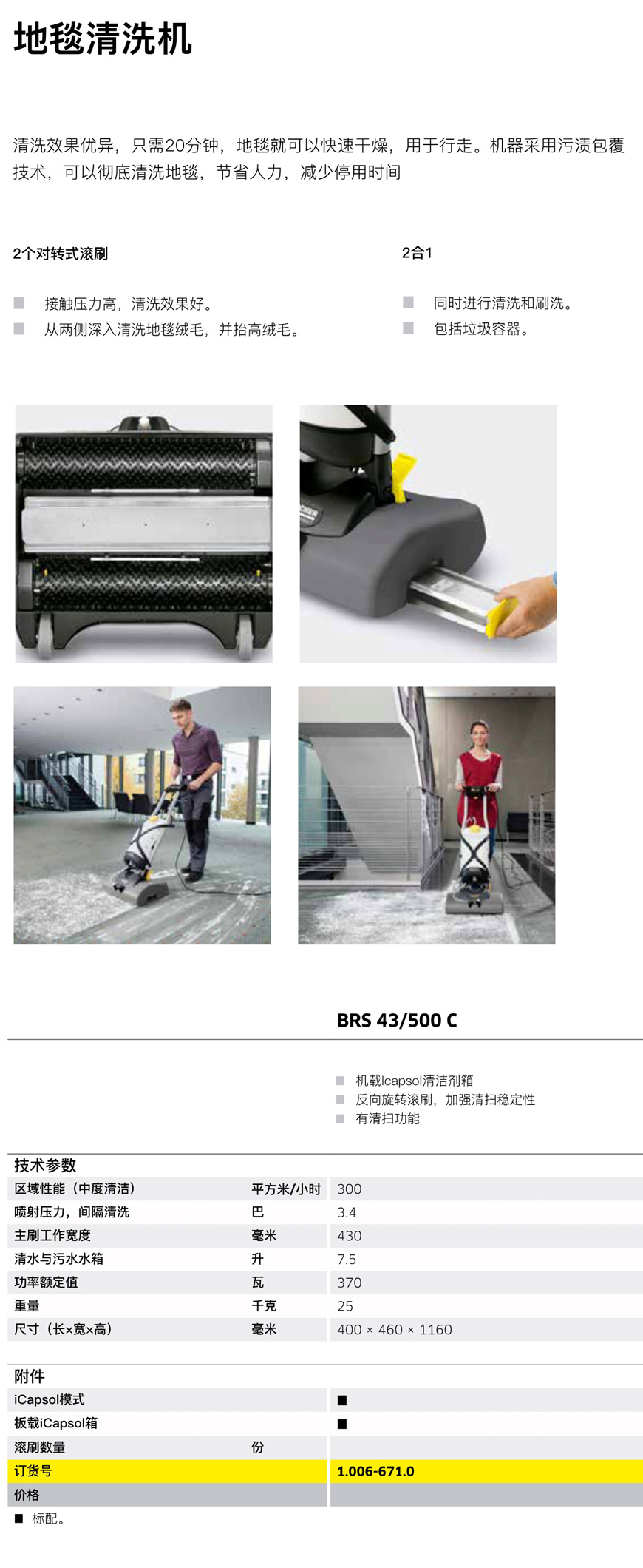 91成人環保設備提(tí)供德國卡赫KARCHER 地毯清洗機BRS43-500C,該款設備清洗效果優異(yì),隻需20分鍾,地毯就可以快速幹燥,用於行走。91成人環保提供該地毯清洗機優惠價格,歡迎谘詢。