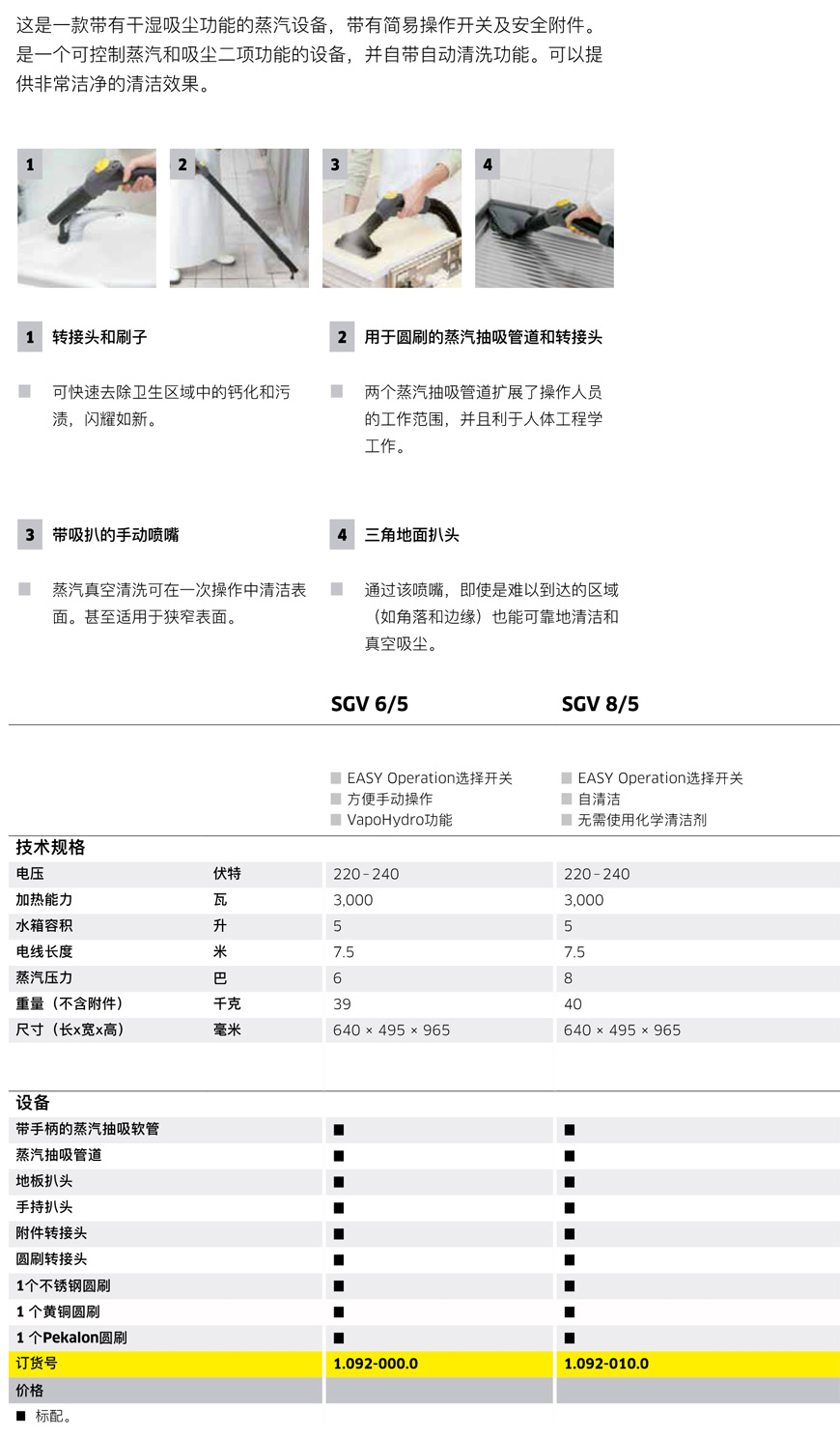 德國(guó)凱馳蒸汽真空清洗機SGV 6/5,蒸汽清洗和幹(gàn)濕吸塵二合一,蒸汽工作(zuò)壓力:6 bar,水箱容量:5 l